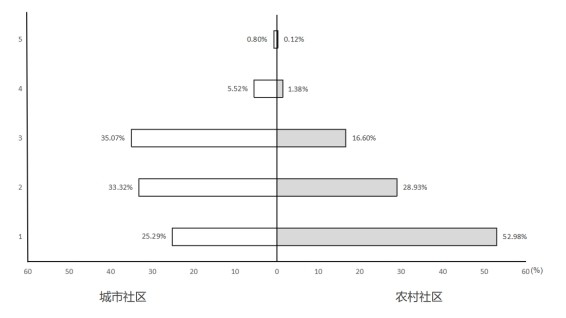 对于收入与资产差距的衡量,本文沿用国际上通用的五分组,每组收入群体各占20%,将居民家庭收入由低到高划分为从1到5这五个等级,并分城乡统计出对应收入组的生育意愿比率。由图可以看出,无论城市社区或农村社区,中低收入家庭的生育意愿明显强于高收入家庭,且城乡社区的生育意愿存在明显差异。城市社区的中等收入家庭生育意愿最强,生育意愿比率为35.07%;而农村社区的低收入家庭生育意愿最强,生育意愿比率高达52.98%。随着收入水平的提升,高收入家庭的生育意愿急剧下降。