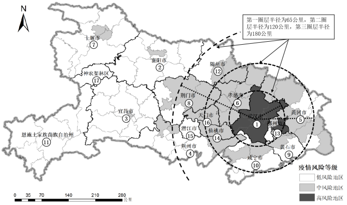 Figure 1 Epidemic Risk Levels, Distance to the Epidemic Center, and Regional Economic Development Level in Hubei