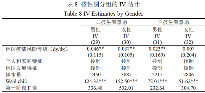 根据模型(5)~(16)的估计结果可知,新冠肺炎疫情对居民二孩、三孩生育意愿的显著促进作用是稳健的,这也进一步证实了基准回归模型的估计结果。