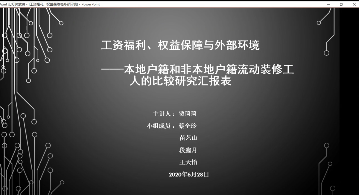 接着是专题二“城市的过客-建筑业工人的权益保障与业余生活”的汇报,组员郑州丽为汇报人,着重描述了自己负责的权益保障部分的研究,详细讲解了自己关于健康状况、劳动合同和社会保障的思路。王春凯师兄就工人签订劳动合同条件提供补充,刘宇洋师兄则对建筑业工人的户籍差异扥西进行点评。