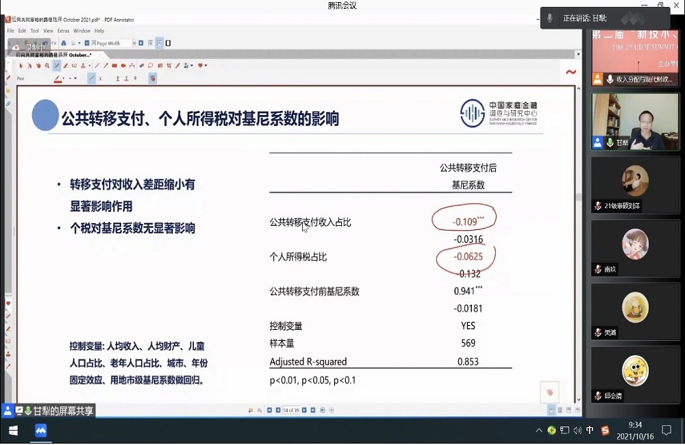 Professor Gan Li, Director of the Survey and Research Centre for China Household Finance, Southwest University of Finance and Economics, spoke on the theme of "Pathways to Common Wealth", starting from the pathways to common wealth in various countries and pointing out that government-led secondary distribution is commonly used to narrow the income and wealth gap through transfer payments. Professor Gan Li points out that public transfers are important pathways to achieve common wealth in China, and that they have a significant impact on narrowing the income gap, especially by increasing transfers to low-income groups, which will effectively boost consumption and promote the "dual circulation". Professor Gan also highlighted the significant effect of pension insurance transfers in regulating income disparity in urban areas, but weaker in regulating income disparity in rural areas.