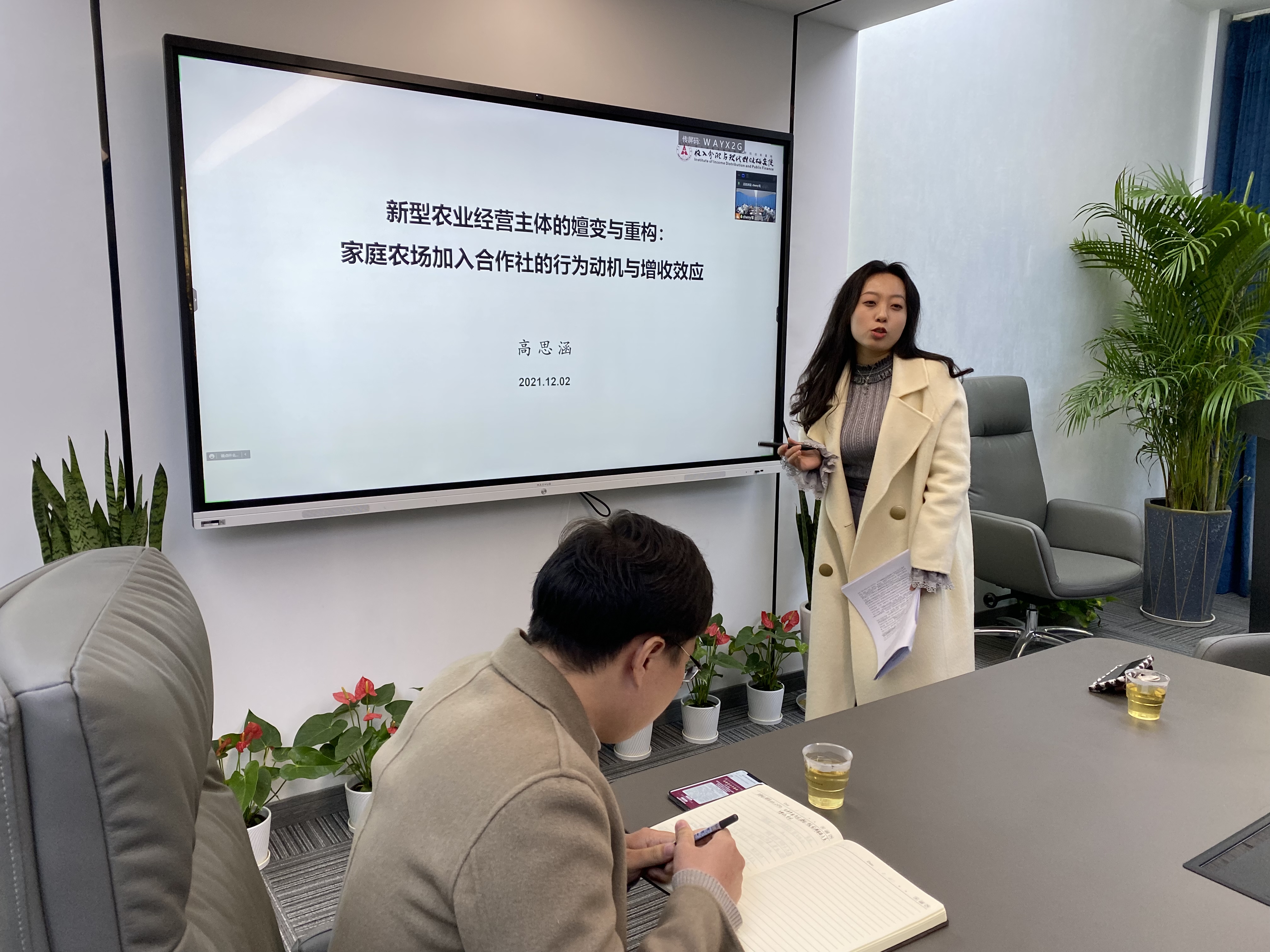 On 2 December 2021, the 8th Xi Xian Academic Luncheon, co-organised by IIDPF and the School of Public Finance and Taxation, was successfully held in Conference Room 119, Wenqin Building. As the keynote speaker of the luncheon, Dr Gao Sihan, a researcher at IIDPF, gave a lecture entitled "Transmutation and Reconstruction of New Agricultural Operators: Behavioural Motivations and Income Increasing Effects of Family Farms Joining Cooperatives". The forum was chaired by researcher Dr Zou Wei. The academic luncheon was attended by more than 40 students and faculty members, including Professor Zhang Kezhong, Dean of the School of Public Finance and Taxation and Deputy Director of the IIDPF, Professor Sun Qunli, Deputy Director, Professor Lu Yuanping, Executive Deputy Director, Dr. Zhou Qiang from the School of Economics, Dr. Yan Weibo from the School of Public Finance and Taxation, and all researchers.