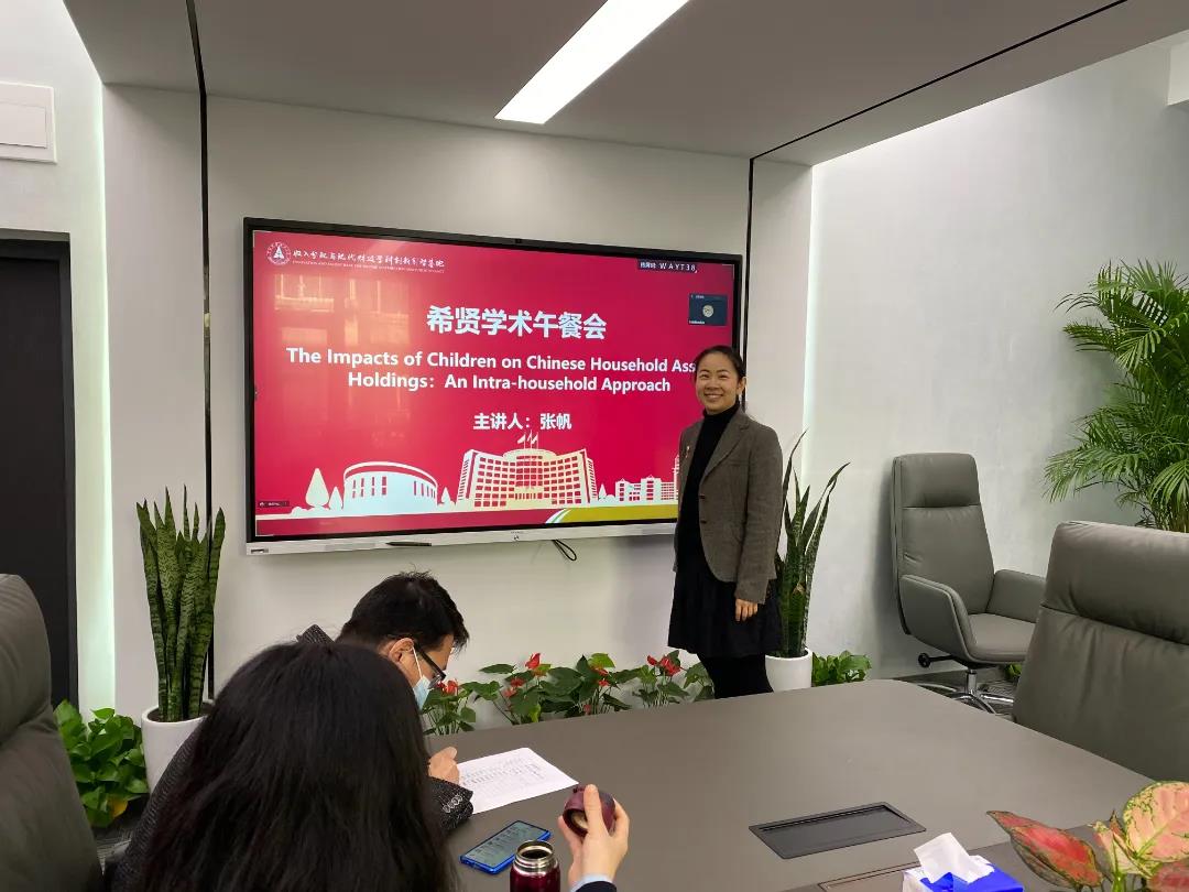 The 7th Xi Xian Academic Luncheon, co-organised by IIDPF and the School of Public Finance and Taxation, was successfully held on 18 November 2021 in Conference Room 119, Wenqin Building. Dr. Zhang Fan, IIDPF Research Fellow, was the guest speaker of this academic luncheon and gave a talk entitled "The Impacts of Children on Chinese Household Asset Holdings: An Intra-household Approach ". The forum was chaired by researcher Dr. Wan Qian. More than 40 students and faculty members, including IIDPF Deputy Director Professor Sun Qunli, Executive Deputy Director Professor Lu Yuanping, Professor Wu Lei from the School of Public Finance and Taxation, Associate Professor Ma Yuanyuan from the Wenlan School of Business, attended the academic luncheon.