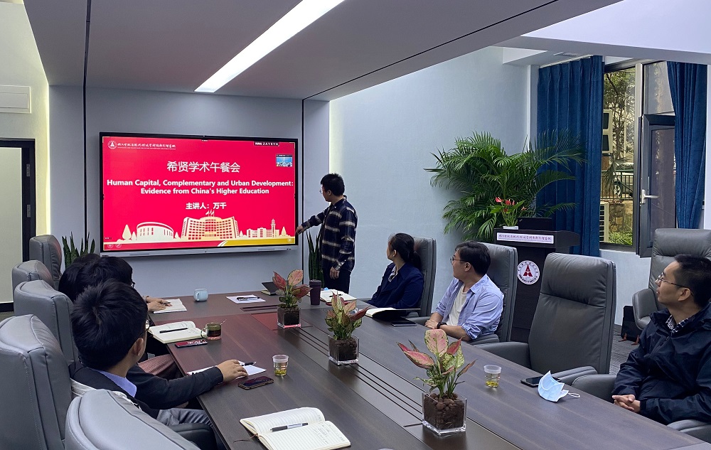 The 4th Xi Xian Academic Luncheon, co-organized by the School of Public Finance and Taxation of and IIDPF, was successfully held on 8 October 2021 in Conference Room 119, Wenqin Building. IIDPF researcher Dr Wan Qian gave a lecture entitled "Human Capital, Skill Complementary and Urban Development: Evidence from China's Higher Education". The forum was hosted by IIDPF researcher Dr. Wan Xin,. More than fifty students and faculty members, including Professor Yang Canming, President of Zhongnan University of Economics and Law and Director of IIDPF, Professor Sun Qunli, Deputy Director, Professor Lu Yuanping, Executive Deputy Director, Professor Yang Guochao of the School of Accounting, and all the researchers, attended the academic luncheon through online and offline hybrid means.