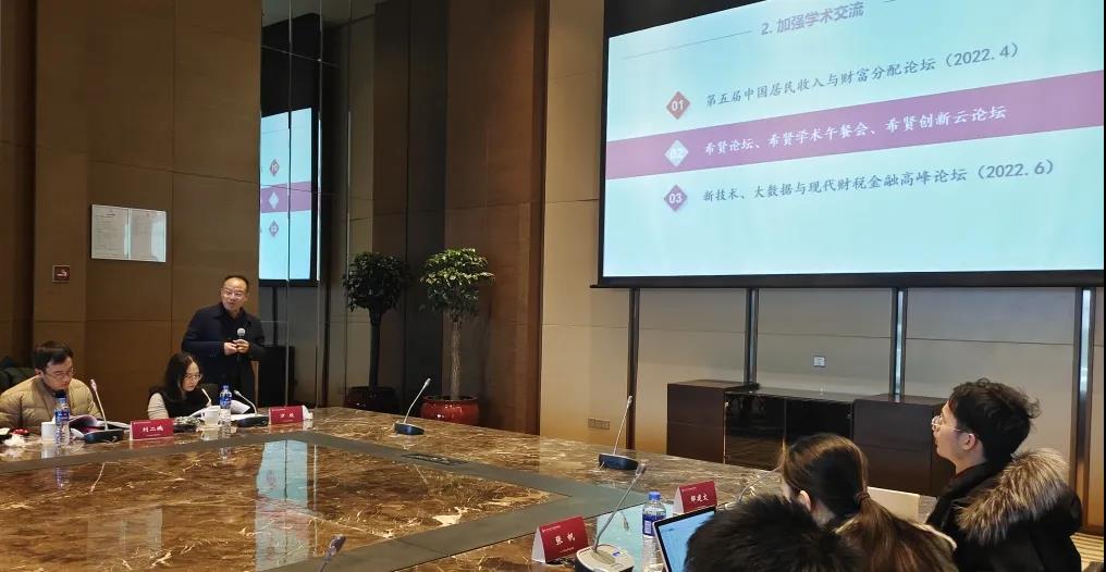 The meeting was chaired by Dr Wan Xin, Director of the Office. Professor Shi Zhilai, Deputy Director of the Department of Scientific Research, Professor Sun Qunli, Deputy Director of IIDPF, Professor Lu Yuanping, Executive Deputy Director, Professor Yang Guochao, Director of the Center for Fiscal Big Data Research, Professor Zeng Jingjing, Director of the Center for Science and Technology Policy and Strategy Research, Associate Professor Ma Yuanyuan, Director of the Center for International Exchange and Cooperation, Dr. Zhou Qiang, Director of the Center for Rural Revitalization Research, Dr. Liu Erpeng, Director of the Center for Think Tank Research, Researchers Professor Wu Lei, Tian Professor Binbin, Associate Professor Yu Changyong, Associate Professor Zhao Ying, Dr. Zhang Fan, Dr. Wan Qian, Dr. Gao Sihan, Dr. Zou Wei and Dr. Zou Jianwen attended the meeting.
