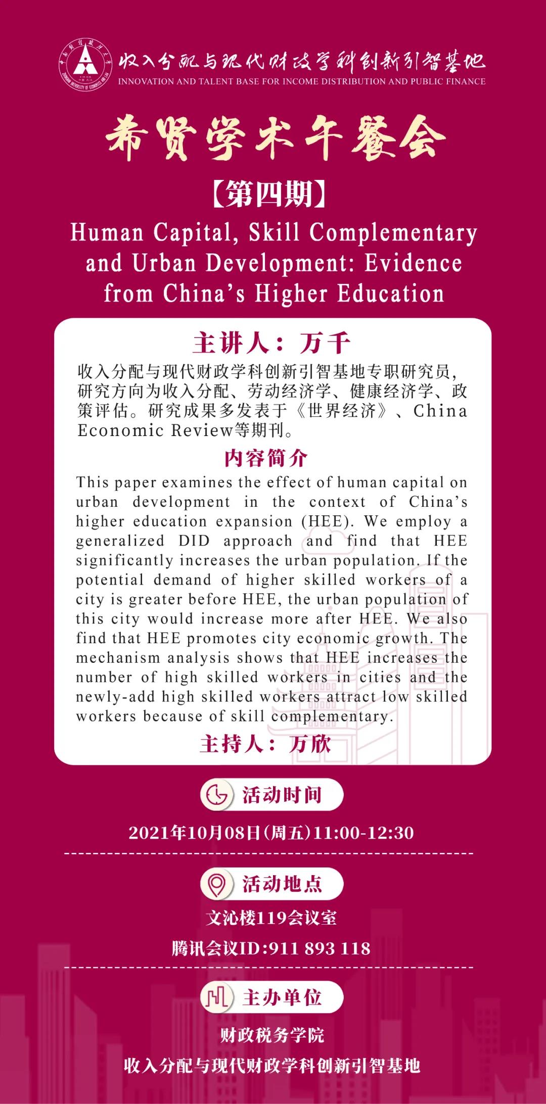 Title of Lecture: Human Capital, Skill Complementary and Urban Development: Evidence from China's Higher Education