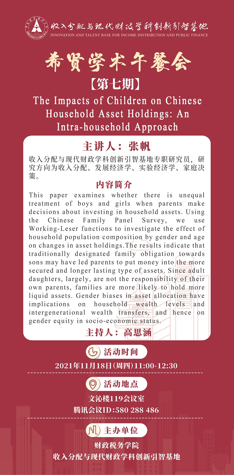 Title of Lecture: The Impacts of Children on Chinese Household Asset Holdings: An Intra-household Approach