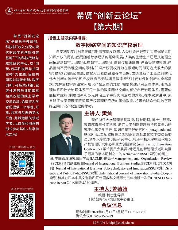 Human society has been protecting the use of intellectual property for centuries, since the patent system began in Venice in 1474. However, with the flourishing of the digital economy, human production has expanded from the physical space to the digital cyberspace. In digital cyberspace, information spreads quickly and innovations are easily copied; product marketing is not limited by physical space and IP infringement can cause significant damage in a short period of time; infringement is highly concealed and infringers can easily hide and remove evidence. The traditional IP system that successfully inspired the great innovations of the industrial revolution is no longer able to meet all the demands for the protection of innovation in the digital economy. In order to solve the difficult problem of IP governance in the digital cyberspace, it is necessary to build a three-in-one IP governance system in the digital cyberspace with government governance system, market governance system and social governance system. The effectiveness of governance needs to be achieved by three means: technology empowerment, institutional innovation and pluralistic governance. In this talk, Professor Huang Can from the Institute of Intellectual Property Management, School of Management, Zhejiang University, will bring his thoughts on the governance of IPR in digital cyberspace to the audience.