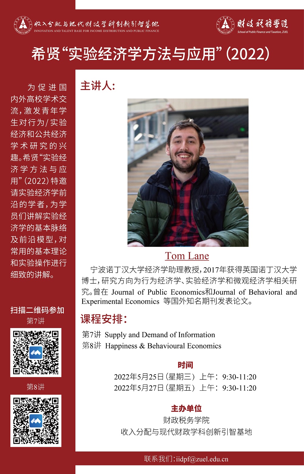 Dr Tom Lane is an Assistant Professor at the University of Nottingham Ningbo and received his PhD from the University of Nottingham in 2017. His research interests are in behavioural economics, experimental economics and microeconomics.Dr Lane has published in leading journals such as the Journal of Public Economics and the Journal of Behavioral and Experimental Economics.