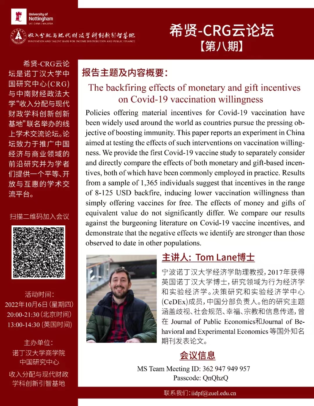 Abstract: Policies offering material incentives for Covid-19 vaccination have been widely used around the world as countries pursue the pressing objective of boosting immunity. This paper reports an experiment in China aimed at testing the effects of such interventions on vaccination willing ness. We provide the first Covid-19 vaccine study to separately consider and directly compare the effects of both monetary and gift-based incentives, both of which have been commonly employed in practice. Results from a sample of 1,365 individuals suggest that incentives in the range of 8-125 USD backfire inducing lower vaccination willingness than simply offering vaccines for free. The effects of money and gifts of equivalent value do not significantly differ. We compare our results against the burgeoning literature on Covid-19 vaccine incentives, and demonstrate that the negative effects we identify are stronger than those observed to date in other populations.