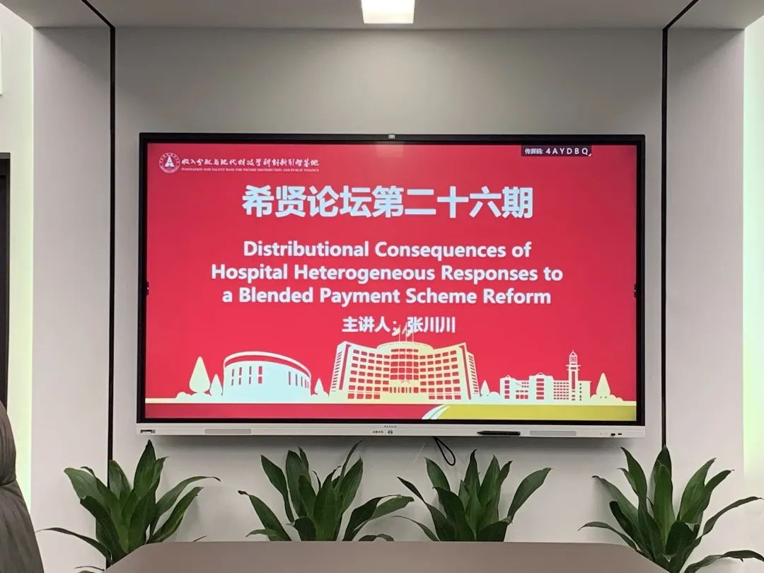 The 26th Xi Xian Forum on Income Distribution and Public Finance, co-organised by IIDPF and the Institute of Public Finance and Taxation, was successfully held on 29 September 2022 in Conference Room 119, Wenqin Building. As the keynote speaker of the 26th Xi Xian Forum, Dr Zhang Chuanchuan, a researcher at the School of Economics, Zhejiang University, was invited to deliver a keynote speech on "Distributional Consequences of Hospital Heterogeneous Responses to a Blended Payment Scheme Reform". The forum was chaired by Professor Lu Yuanping, Executive Deputy Director of IIDPF, and was attended by Professor Sun Qunli, Deputy Director, and over 30 faculty members and students of IIDPF through online and offline approaches.