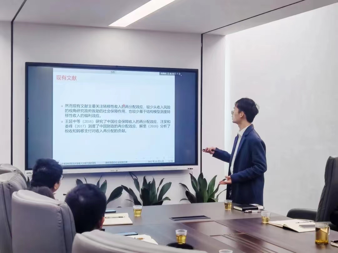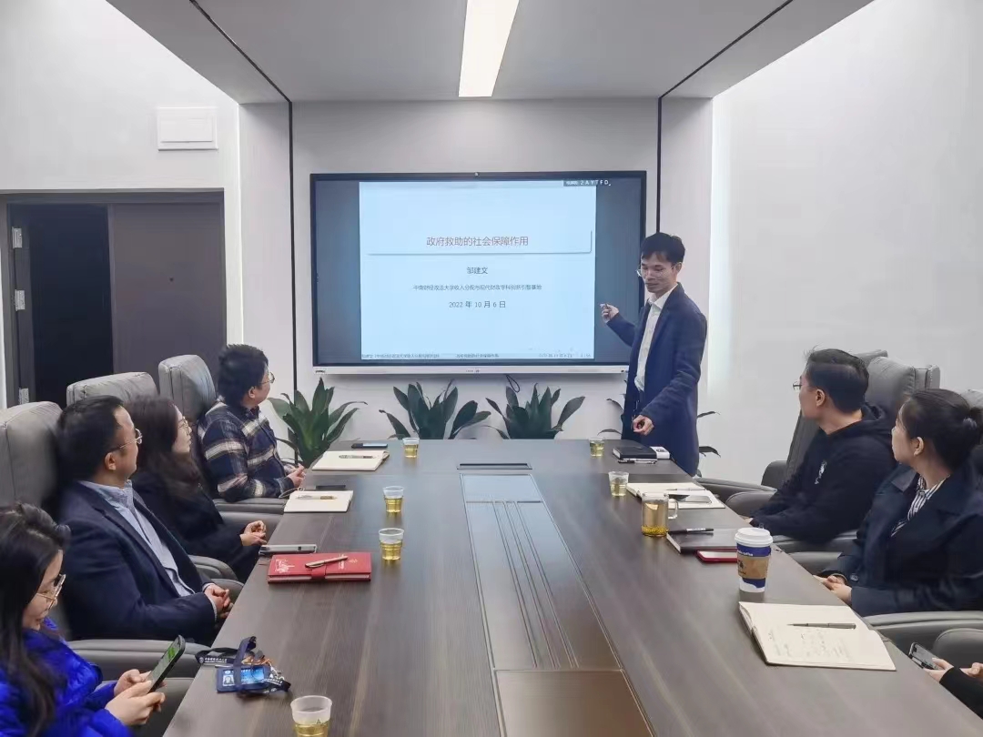 The 19th Xi Xian Academic Luncheon, jointly organised by IIDPF and the School of Public Finance and Taxation, was successfully held on 6 October 2022 in Conference Room 119, Wenqin Building. Dr Zou Jianwen, a full-time researcher at IIDPF, presented a keynote speech on The Social Security Role of Government Assistance - A Life Cycle Model-based Analysis. The academic luncheon was chaired by Associate Professor Wan Qian, a researcher of IIDPF, and was attended by over forty participants, including Professor Lu Yuanping, Executive Deputy Director of IIDPF, researcher Dr Wan Xin and other faculty and students for discussions and exchanges.