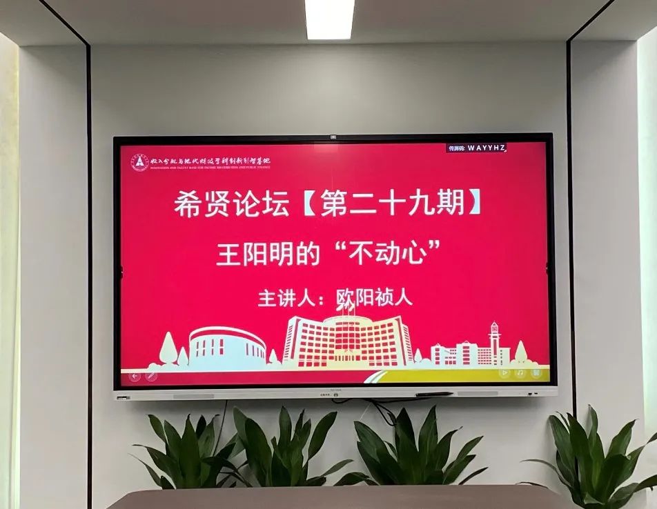 The 29th Xi Xian Forum, co-organized by IIDPF and the School of Public Finance and Taxation, was successfully held on November 17, 2022 in Conference Room 119 of Wenqin Building. Professor Ouyang Zhenren from the Center for the Study of Chinese Traditional Culture of Wuhan University was invited to give a speech on "Wang Yangming's Mind Like Water" as the keynote speaker of the 29th Academic Forum. The forum was chaired by Professor Sun Qunli, Deputy Director of IIDPF, and was attended by more than 20 students and faculty members, including Professor Zhang Kezhong, Dean of the School of Public Finance and Taxation, Professor Guo Yuemei, Professor Lu Yuanping, Executive Director of IIDPF, and Researcher Professor Ke Ling.