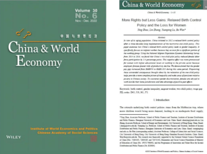 The research results of More Rights but Less Gains: Relaxed Birth Control Policy and the Loss for Women by Professor Lu Yuanping and Associate Professor Zhao Ying of IIDPF were published in the prestigious journal China & World Economy on 12 January 2023. The journal China & World Economy has been published.