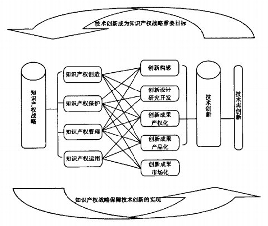 知识产权战略与技术创新具有紧密结合性,这体现为知识产权战略贯穿于技术创新的全过程,无论是创新成果的构思、技术方案设计、创新成果的产权化和产品化,以及创新成果的市场化和对创新成果的保护等,都是知识产权战略运行的环节和内容,两者之间是一种良性互动的关系。在推进我国知识产权战略实施时,需要保持与技术创新的良性互动。这种良性互动体现于两者具有高度的一致性,相辅相成, “知识产权战略的实施有助于自主技术创新的开展,而自主技术创新的开发反过来有助于知识产权战略的实施”:“知识产权战略的实施与自主技术创新的开展都是知识管理的不同表现形式。创新性技术是知识产权的潜在性内容,而知识产权也可以促进技术创新的实现,反过来又扩展了知识产权的内涵。”【2】