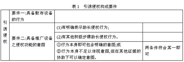 在Grokster案的判决中,最高法院将引诱侵权定义为:如果当事人散布设备的行为具有推广该设备侵犯著作权利用的目的,例如通过明确表示或者其他积极步骤助长侵权,其应该对第三方因此实施的侵权行为承担责任。【27】根据这个定义,引诱侵权可以分解为两个要件(见表1):