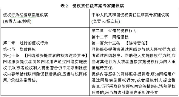 有鉴于此,我国要想在网络时代及时使法律跟上技术发展的步伐,维护产业的合法利益,需要建立起明晰的间接责任归责原则,使相关产业中的主体能确定的预见其行为的法律后果,以降低网络环境下的信息交易成本。值得肯定的是,我国有两部侵权责任法草案专家建议稿中,都在不同程度上规定了网络环境下间接责任归责原则(见表2)。