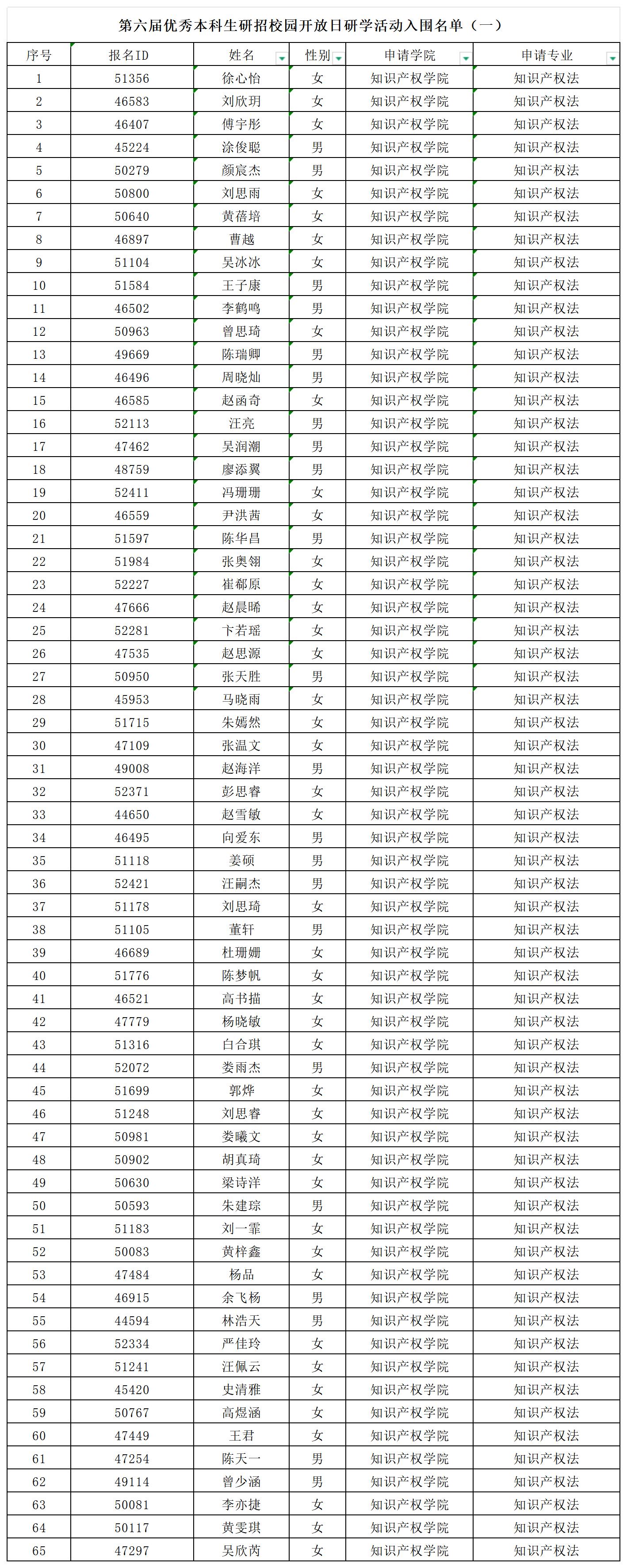 经本人申报,学院遴选,拟确定以下同学入围知识产权学院2025年第六届“优秀本科生研招校园开放日”研学活动(名单请见附件)。