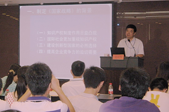 知识产权局的工作人员热情地欢迎同学们的到来,还精心地为同学们准备了学习资料。董宏伟局长首先对学员们的到来表示欢迎,并简要介绍了武汉市知识产权局的基本情况。之后,他围绕《国家知识产权战略纲要》及武汉市的知识产权工作进行了演讲,使学员们对《纲要》的制定背景、核心内容有了明确的认识,并对武汉市知识产权局的主要职能及工作开展有了深入的了解。随后,学员们积极踊跃地与董宏伟局长进行了互动交流,内容涉及知识产权维权援助中心的工作开展、知识产权战略在武汉企业中的实施情况、地理标志在武汉的知识产权保护现状以及武汉知识产权局地位和作用的有效发挥等十个问题。董宏伟局长耐心细致地一一作答,赢得学员们阵阵热烈的掌声。最后,学员们在工作人员的引导下参观了知识产权局陈列室、知识产权维权援助中心、国家专利技术展示交易中心等场所,切身感受到了武汉市知识产权局工作的环境。