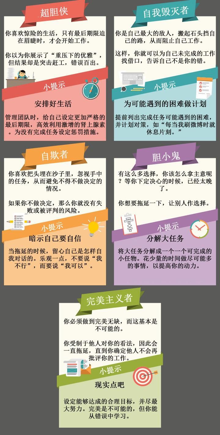 这就引出了以下问题:如何理解自己是为什么或是怎样拖延的?怎样确切地知道自己是哪种类型的拖延症患者?根据下面图表的问题进行测试,以了解自己是怎样拖延的。一旦清楚了这些,我们就可以控制拖延的情况,提高工作效率。