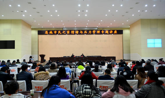 恩施市市长助理林险峰主持讲座,并勉励全体参会人员借助此将自己的心理调整到最佳状态,健康地生活,愉快地工作,为群众提供最优质的服务,为恩施市经济社会发展作出应有的贡献。