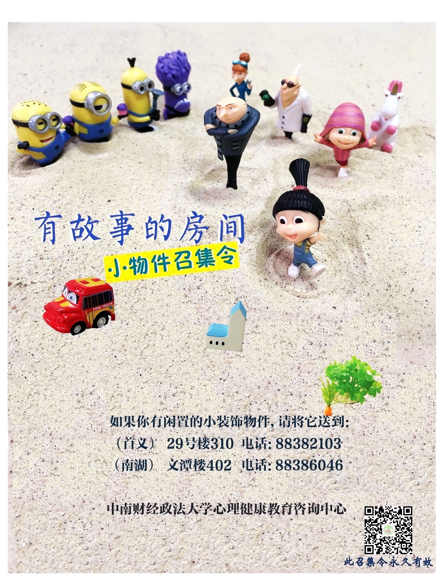 在沙盘室建立的同时,一个名叫“有故事的房间”的活动悄悄进入心理咨询中心官方微博微信平台“晓南心语”(微信号:znufe88386046),登录各个班级,旨在鼓励同学们捐赠一些有故事却又闲置的小物件,帮助完善沙盘室的建设。