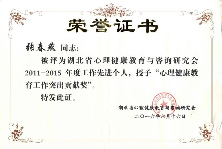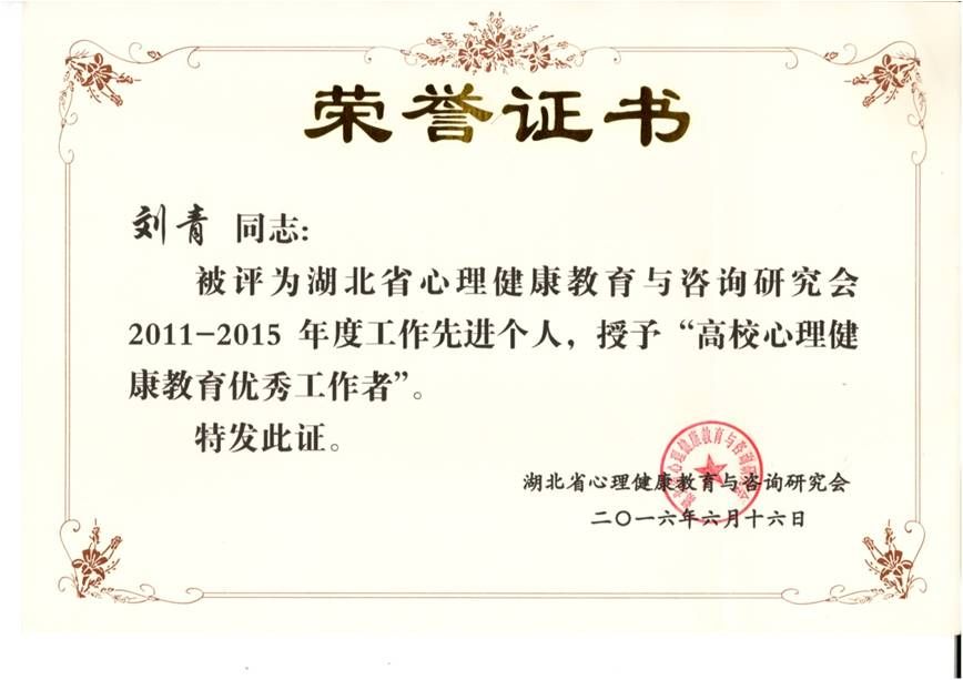 (通讯员:余金聪)6月15-16日,湖北省心理健康教育与咨询研究会2016年年会暨全省高校心理健康教育(管理能力和体制机制创新)专题培训班在华中师范大学举行,我校心理健康教育咨询中心专职教师张春燕和刘青获评湖北省2011-2015年度大学生心理健康教育工作先进个人,分别被授予“心理健康教育突出贡献奖”和“高校心理健康教育优秀工作者”称号。