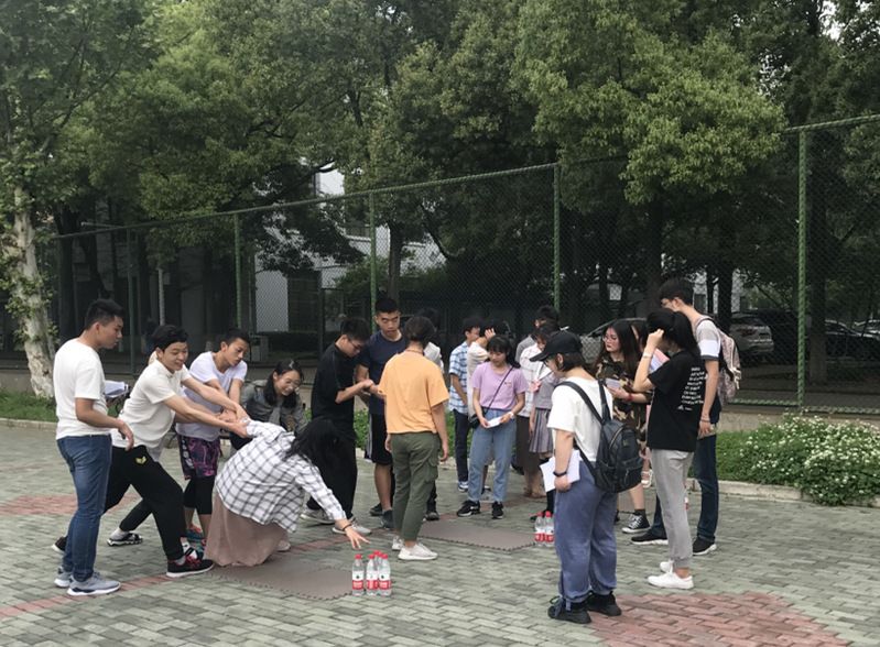 第四站——“搭桥取水”,此项项目要求队员必须完全相信自己的队友,把身体托付给他们,自己尽全力伸手拿回一定距离之外的水瓶。通过游戏,可以提升队员相互之间的默契。