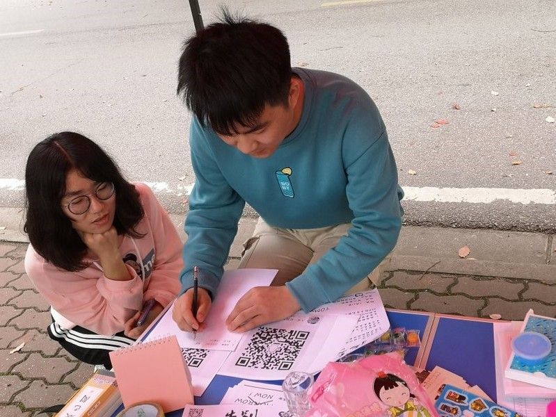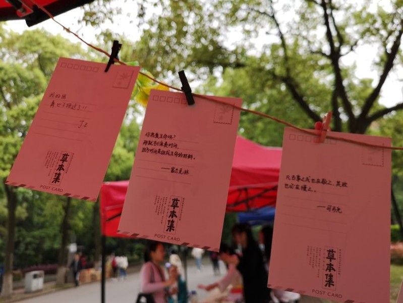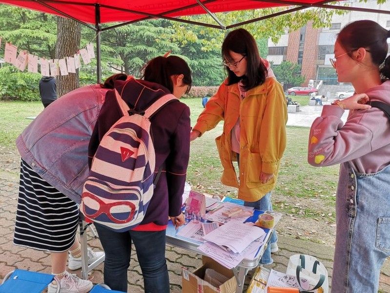 本次活动分为线上线下两个环节:参与者可以通过扫描桌上的二维码加群,每天打卡坚持进行为期两周的学习或其他类活动并发截图证明,两周后,完成任务者可获得奖品;参与者也可通过在做心理测试或者在卡片上写下“战拖神句”,赢得奖品。活动进行过程中,有的同学也主动来到账篷下询问,并扫码入群,并在群内备注姓名加任务,便于学生干部登记督促,或是做测试检验自己的拖延程度,在明信片上写下战胜拖延症句子,挂于帐篷两端,并与他人的卡片交换。其中,有一个参与者称赞道:“你们这个活动真的很有意义!”于我们而言,大家的认同,就是对这个活动最大的鼓励。