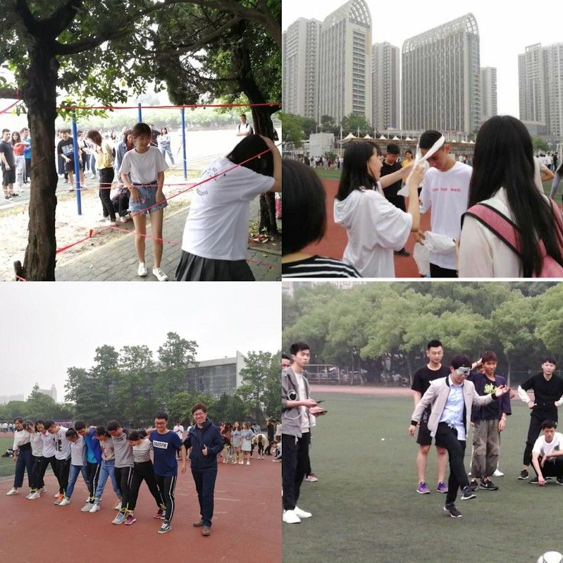 本次趣味运动会由“蒙眼踢球”“偷天换日”“齐心前行”和“救死扶伤”等四个户外素质拓展游戏构成。“蒙眼踢球”要求每班派出两名同学,一人蒙眼,一人指挥蒙眼者将球踢进球框。“偷天换日”需要同学无接触地穿过障碍阵。“齐心前行”则需要同学们“十人九脚”,共同到达终点。“救死扶伤”要求同学们在短时间内包扎好相应部位并接受检验。各个班级有组织地完成了游戏,并留下笑容灿烂的合照。