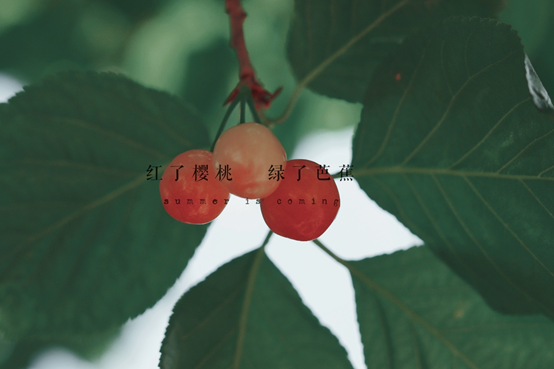 如果要用一个词来形容熟透的樱桃,我觉得“红润剔透”最合适。熟透的樱桃一个个胀鼓鼓、圆溜溜的,在阳光的照射下,金光闪闪。从青到淡黄再变成大红,青涩的为了成熟暗自努力,三月白里透粉的樱桃花是它努力的最好证明。樱桃红的有力发亮,像是祖国的后浪,也是我对你唇红齿白的向往。