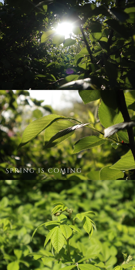 图1是光打在叶子之间;图2是叶子感受到光的沐浴,正快活地晒太阳;图3是新生的树芽,充满生机;插入的英文则意为春天正在到来。