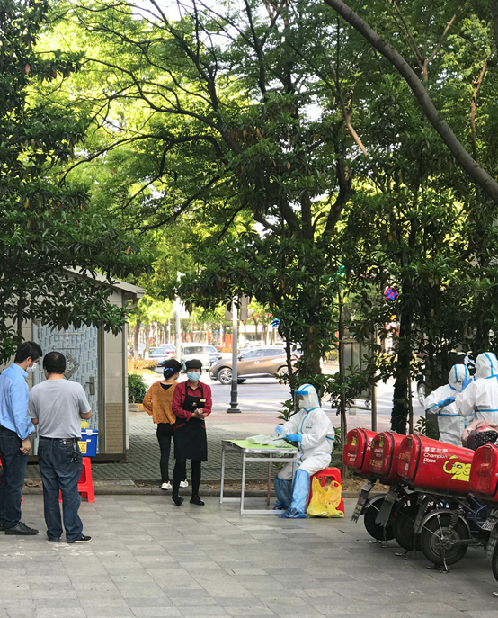 在大家的共同努力下,武汉疫情已经好转了,街头有穿防护服的检测人员对居民进行核酸检测。城市正在恢复正常的过程中。