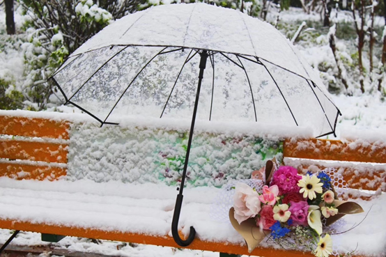 2020年4月10日,鹤壁这座小城的华夏南路上樱花正值盛放,本应温润如玉的人间四月天却漫天飞雪……当雪花缀满了樱树的枝头竟成了一幅别样的世间胜景,些许爱美的人们不顾冰天雪地的严寒前来赏此花雪。鹤壁一家叫“莫奈花园”的花店,花艺师特意扎上一束鲜活的捧花走上樱花大道去记录这场浪漫。此时,伞和捧花暂且搁置在街道的座椅上,与椅后的樱树林和落雪组成了另一个旖旎的世界。