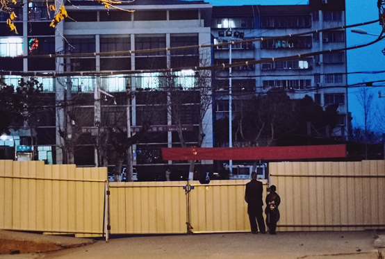 曾经车水马龙的路口如今空无一人,冷冰冰的蓝色大铁皮威严地矗立在那里,将道路划分成一个个狭小无趣的田字格。铁皮外是漆蓝色的夜和曾经喧闹的学校,路灯昏黄的灯辉洒落,一对父子透过缝隙想要窥探铁皮外的世界。