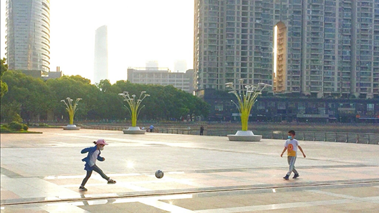 图为武汉市西北湖广场上,两个小孩在踢球。