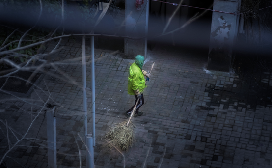 正是社区严格封禁的时期,又是清晨,外面特别安静,竹叶扫帚划过地面的声音引我看向窗外。清洁工手持扫帚,全副武装,身上的荧光工作服在冬春交际的昏暗清晨里显得引人注目,却在疫情肆虐下空荡荡的户外显得默默无闻。我们歌颂一线医护人员守护生命,也同样应该感恩这些在自己岗位上间接守护社会的人们。所谓动人总是见于平凡,所谓伟大总是见于寻常。
