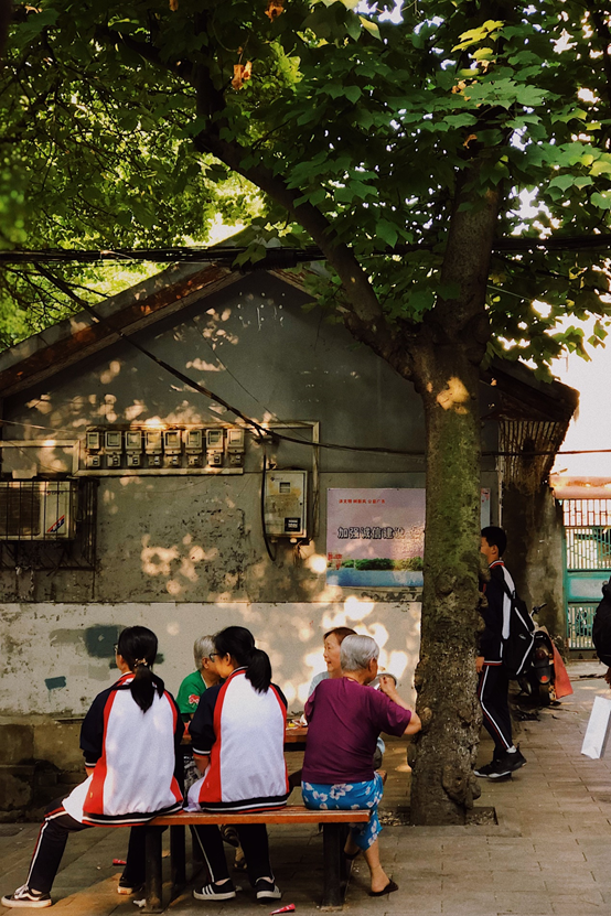 本张摄于夏转秋的粮道街。武汉中学的女生和街坊奶奶围坐在梧桐树下,彼此笑着不同的话头,在这一天下午相遇,像毛茸茸的梧桐果子遇上宽厚的梧桐叶子,也像窗口晒出去的亚麻枕套遇上刚好吹起的风。人总说日子过了就好了,这大抵便是我们的“日子”,便是“好了”。