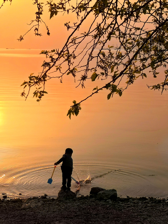 有人戏水,鞋子衣服都沾湿了,他却笑嘻嘻地说,妈妈,今天的水都是亮晶晶的,可真好看。这是发生在巢湖边,四次落日时分其中之一的故事。这是一个不经意的瞬间,渺小简单,却让我一瞬间恍然,每次细细回想,小孩子那段稚气欢乐的话语都会让我感到治愈至极。原来,幸福可以这么简单。总有人说人间不值得,殊不知,这样的人间温柔可能就围绕在我们身边。我在人间贩卖落日,只为收集世间温柔,告诉自己,人间温柔,不虚此行。
