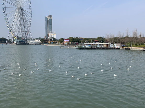 走到木桥的尽头便是蠡湖。标志性的摩天轮近在眼前,每个夜晚,这便成了蠡湖之光,即使在十几公里外的住宅楼上,也能一眼就看见它。冬日不常见的水鸟也探知到了悄然而至的春天,它们分散着浮在水面上,感受着春日的勃勃生机,乍一看还以为是散落在蓝绸缎上的珍珠。那湖水清澈得很,低头便能看见水中的藻荇和穿梭的鱼儿。好一个“沙鸥翔集,锦鳞游泳,岸芷汀兰,郁郁青青。”