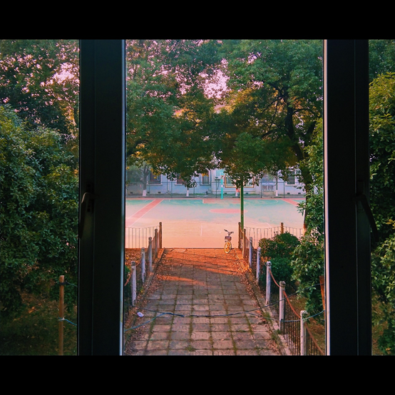 上午的阳光透过树叶的缝隙散射下来,五彩的色彩,孤零的单车与周围的景物相互映照,构成一副多彩风景画,而窗户则是天然的相框。