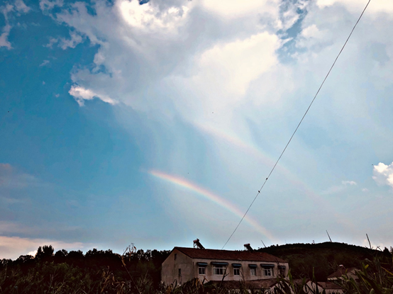 照片中的“双彩虹”正好出现在我支教的最后一天。最后一天没有上课,和孩子们一起办了一场汇报演出。演出结束后,和往常一样,几个人一起回住的地方,在路上幸运地看到了这个“双彩虹”。我想,其中一道彩虹送给孩子们,祝他们健康成长;一道彩虹送给我们这四个一起奋斗了一个月的“老师”,我们会永远记住这段日子和这些孩子。