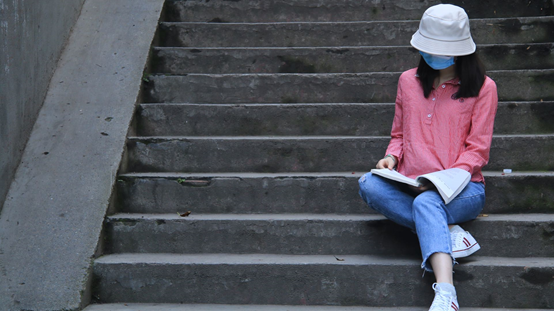 在博爱书城旁一条长长的石梯上,一位身着红衣蓝裤的女孩正垂首专心致志地阅读,值得注意的是,她还戴着口罩。闹市之中,看书的女孩透出一丝安静和美好的气质。