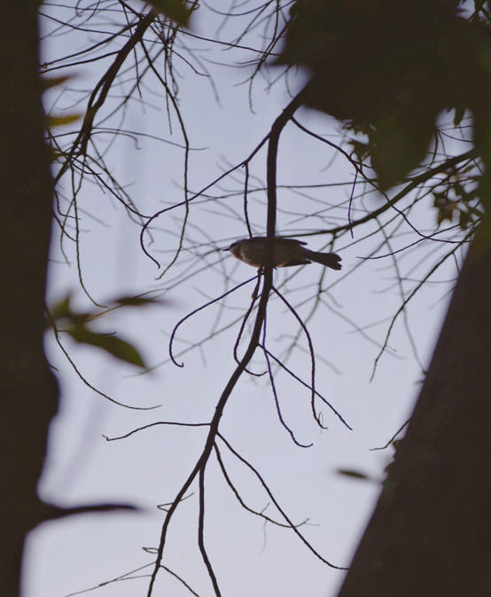 近黄昏时漫步于小区后山,鸟鸣清脆、树影婆娑,仿佛时间静止与世隔绝,抬头见雀鸟在枝丫上鸣叫便按下快门记录这一刻。在武汉解封之际的特殊的时刻,仿佛是在报喜,且麻雀身前树叶交错身后枝丫杂乱,又像是预示着武汉经历重重困难但最终会在逆境中重生,为人民送去喜报。