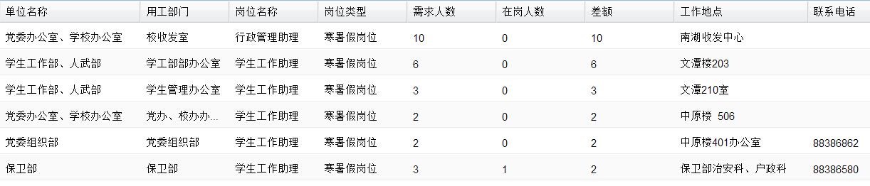 勤工助学是在校本科生培养自强性格、增强实践能力的重要途径,现将我校最新勤工助学空缺岗位予以发布,有意向的同学请及时登录勤工助学系统(我的勤工助学-可申请岗位)查看、申请。具体岗位分布如下: