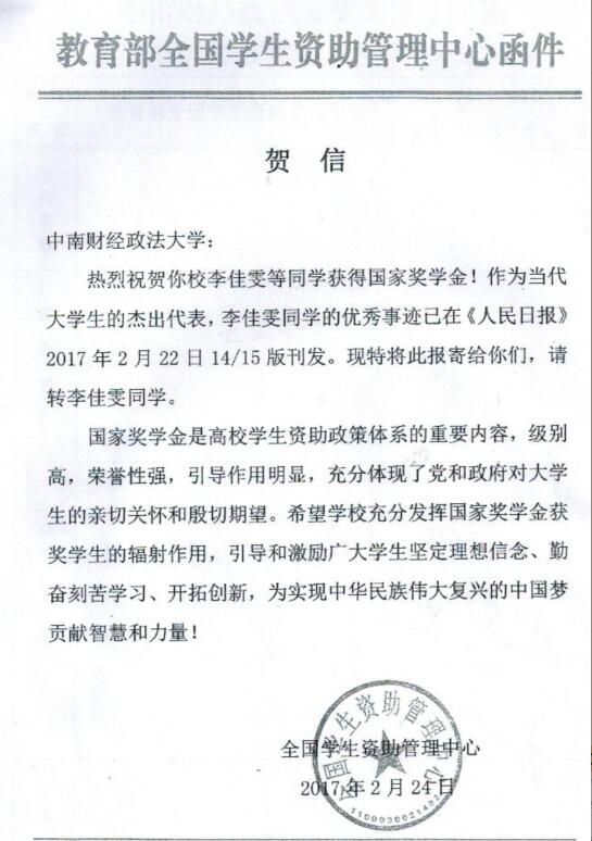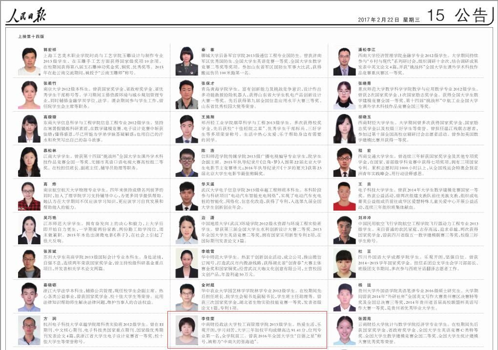 近日,全国资助管理中心发来贺信,我校推荐的国奖获得者——李佳雯同学作为当代大学生的杰出代表,其优秀事迹在《人民日报》2017年2月22日14/15版刊发。