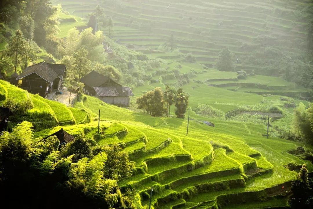 大巴行驶在蜿蜒的山路上,窗外青山绿水与蓝天白云交相辉映美不胜收,途中还经过了世界灌溉工程遗产紫鹊界梯田。