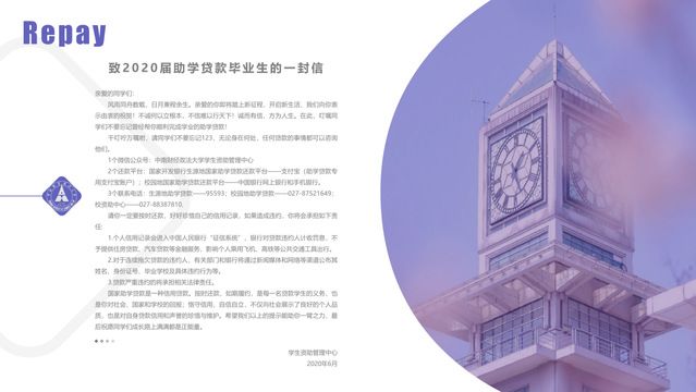 另外,资助中心精心为贷款毕业生设计了一封带有本校情怀的信,发送至贷款毕业生邮箱,提醒大家珍惜信用记录。希望每位贷款毕业生收到这封信时,能铭记母校的关爱与叮咛,不忘1个微信公众号,2个还款平台,3个联系电话,按时还款。