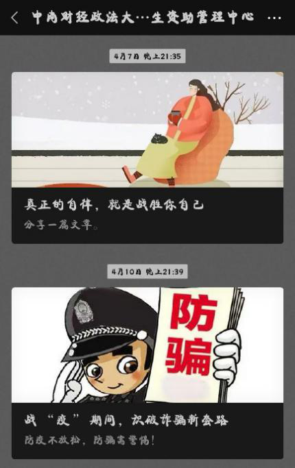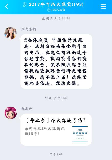 疫情期间,诈骗手段层出不穷,资助中心及时提醒辅导员老师,告诫学生谨防骗子利用上网课实行诈骗。另外,中心还利用三部热线电话、一个微信公众号、各类贷款QQ群,耐心解答学生的还贷问题,加强校园贷防诈骗宣传,引导学生做好毕业前准备工作。