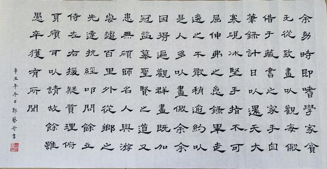 (作品选自《送东阳马生序》,文中宋濂因家境贫寒无书可读,就向有藏书的人家借书抄录来读,这位借书的先生在很小的方面实现了助学。隶书的字形比较符合我对“助学”的理解:助学的动作不必很大,很小是举动也能有巨大的帮助。)